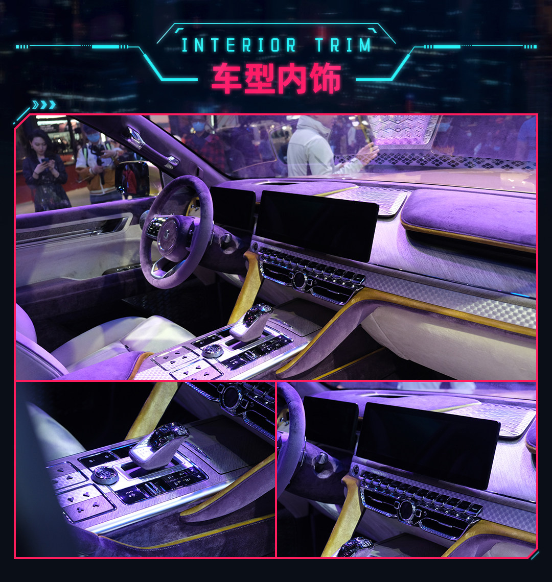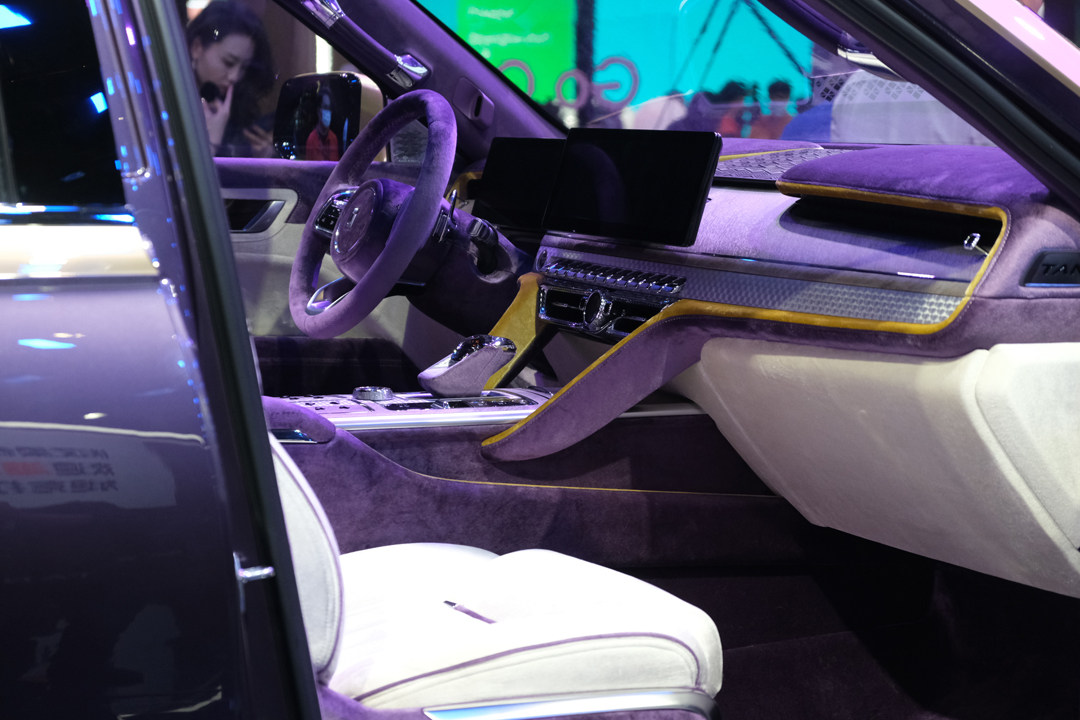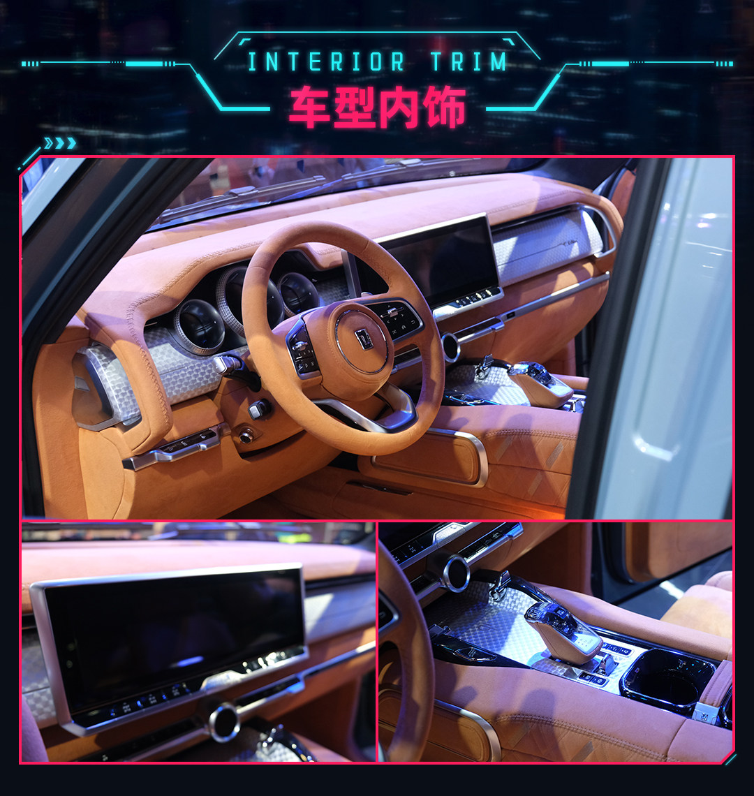 坦克800的内饰注重氛围的营造,色彩方面如外观一样大胆,黑内饰配合黄色饰条点缀具有很强的视觉冲击力,同时车辆还会有全液晶仪表以及超大尺寸的中央显示屏,同时还会配有水晶电子挡杆。