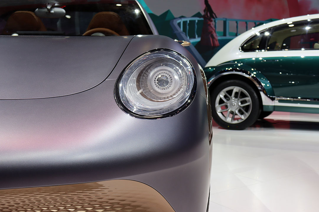到了尾部,整体的造型设计与911、甲壳虫极为相似,后挡风玻璃延伸至车顶上方,面积相当大。而椭圆形的尾灯设计营造出一定复古的风格,下方金色的饰条与车头呼应。