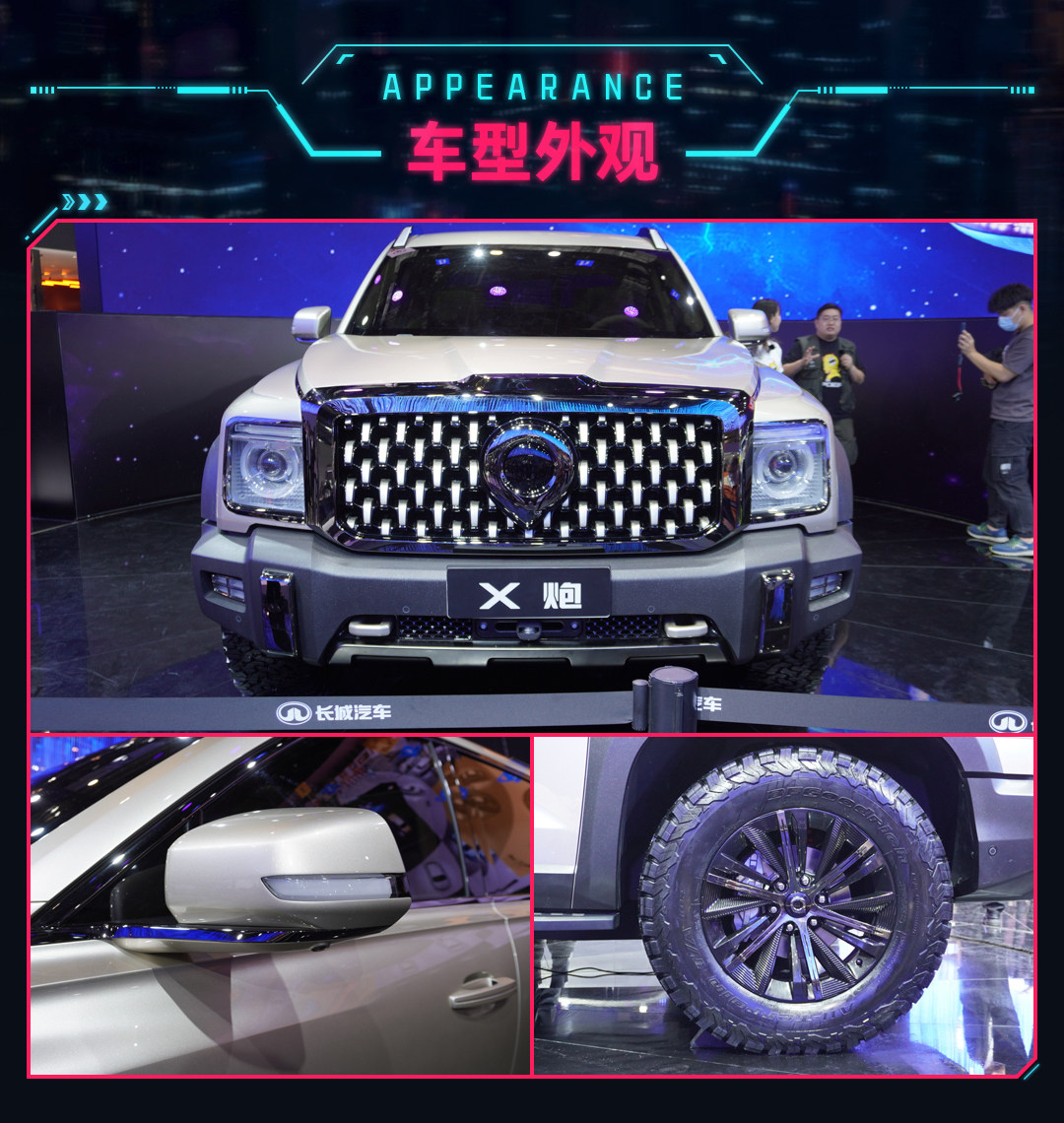 根据官方介绍,这款全新皮卡将会是一款“全尺寸”炮,不过目前车辆还没有正式命名,我们暂时只能称其为“X炮”。但从外观设计来看,X炮硕大的车身尺寸在展台上确实十分抢眼。