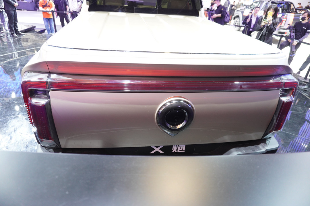 在车尾方面,X炮的尾灯组采用了贯穿式的设计。而在皮卡车型标志性的货斗结构上,X炮的货斗上方设计有盖板,但由于车辆并未做功能展示,因此并不清楚货斗盖板的收纳方式,如果无法拆卸且不可折叠收纳,这或许会对X炮的置物能力带来一定的影响。
