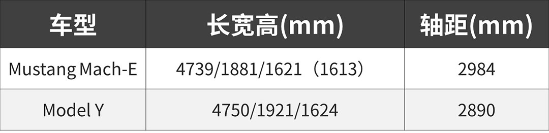 Model Y的长宽高分别为4750/1921/1624mm,轴距为2890mm,对比起二者,特斯拉Model Y在尺寸上稍稍占有,但轴距上福特Mustang Mach-E要领先94mm,这将直接体现在车辆后排空间上。