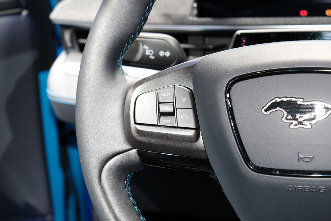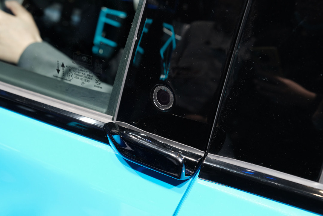 还有一个有意思的点,Mustang Mach-E并没有传统意义上的门把手,而是提供四个按钮,按下后车辆自动打开,前门带有一个“小把手”,而后门则是完全无把手设计。