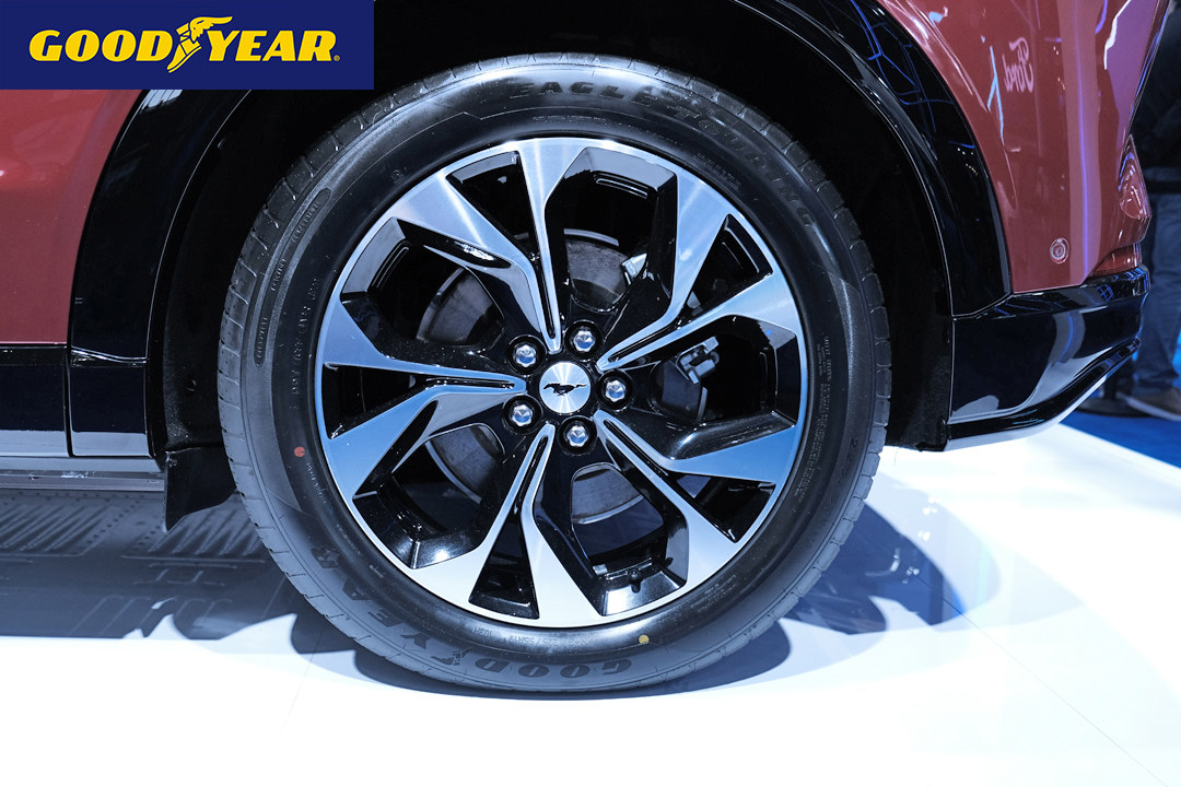 固特异轮胎分为几个大系列,其中Mustang Mach-E使用的EAGLE TOURING系列拥有EAGLE系列的抓地力以及操控性,该系列的轮胎主打强悍的抓地技术,结合外侧宽大坚实的胎肩,在车辆过弯时增加接地面积,确保出色的过弯稳定性和优秀转向响应,给车主带来直接的操控感受。
