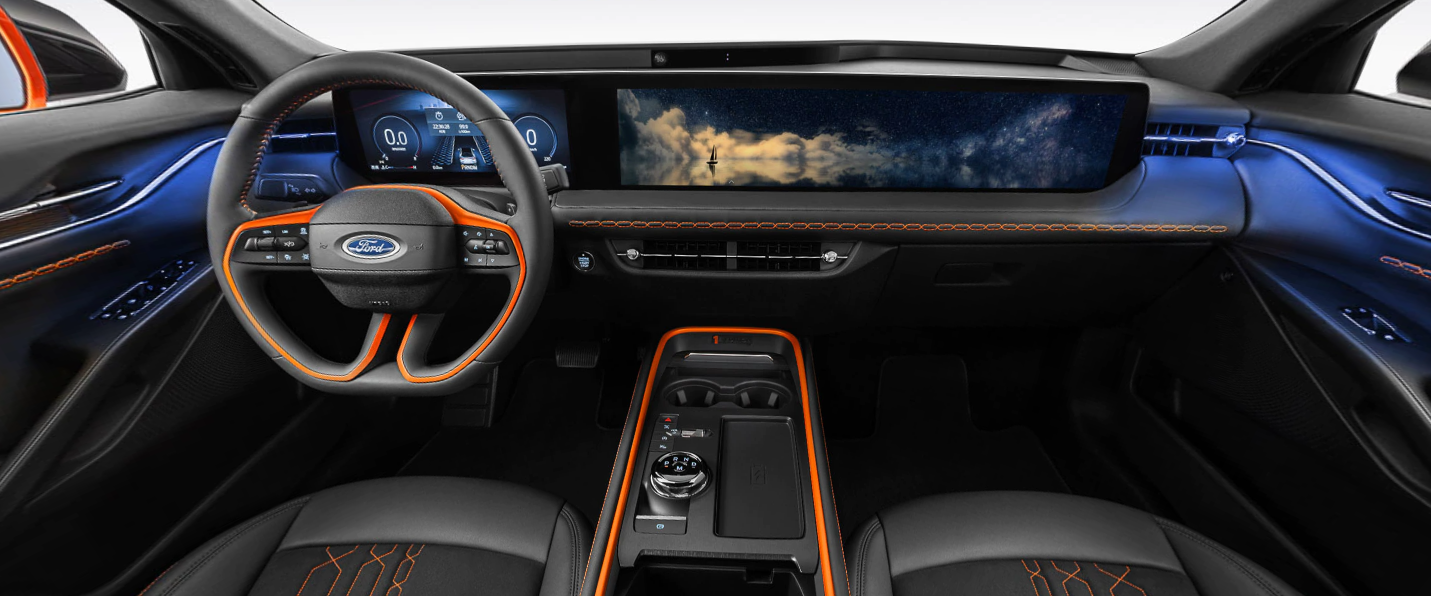 最博眼球的莫过于这块12.3英寸(液晶仪表)+27英寸大联屏,整块屏幕组合在一起长达1.1米,堪称“巨屏”!而这块屏幕内配备的是福特2.0智行互联系统,细心可以发现该屏幕已经延伸至副驾一侧,所以在实际使用中,副驾驶也能分担一些屏幕内容,例如中途需要导航、切换功能等。