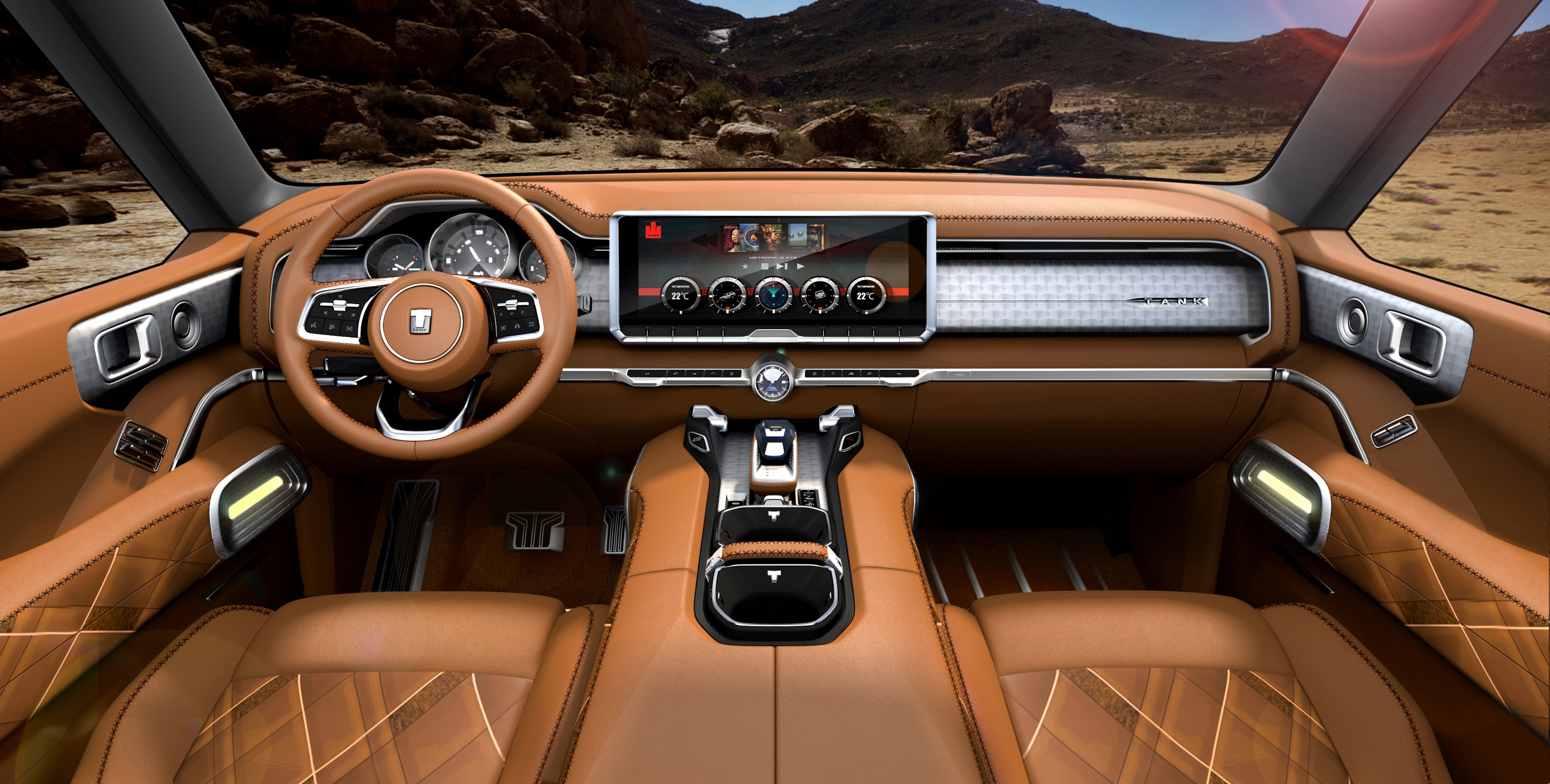 内饰设计则与狂野的外观形成极致的反差感,内饰布局上,仪表板布局灵感来自“TANK” 的字母“T”,简洁大方。在细节处理上,换挡把手、按钮按键等造型经历了千锤百炼式的雕琢,兼具功能属性与美感;在材质搭配上,真铝金属、璀璨水晶和柔软丝绒的结合,彰显了坦克的匠心精神,营造出头等舱式的尊享奢华感。坦克700奢华舒适的内饰与狂野硬朗的外观构成了对立统一的美感,将狂野与豪华有效融合,共同为用户营造了纵情越野的驾乘氛围。