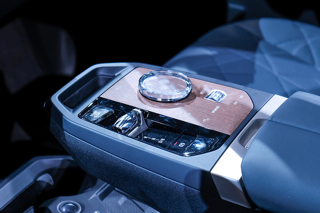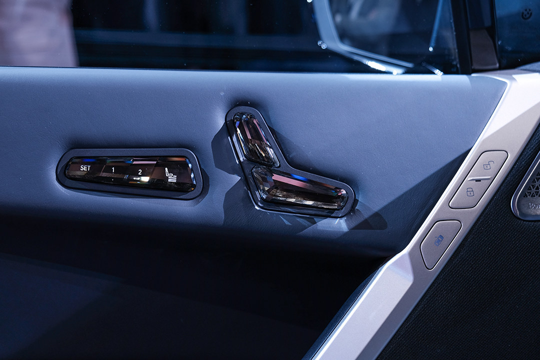 先来看看宝马iX,它采用了一个不规则的双辐式方向盘,整体贯通式中控台以及悬浮式微边框曲面屏;这种简约的内饰设计并非第一次在宝马车型身上出现,此前教授也曾在i3身上见到过类似的内饰设计,但是在iX身上,立体感更强的多面体中控台和显示效果和UI设计都更加出色的多媒体屏幕都使这个内饰看起来更具高级感,再加上随处可见的水晶拨轮、旋钮、按键以及香槟金色的金属饰件,让iX的内饰展现出一种时尚精致的豪华感。