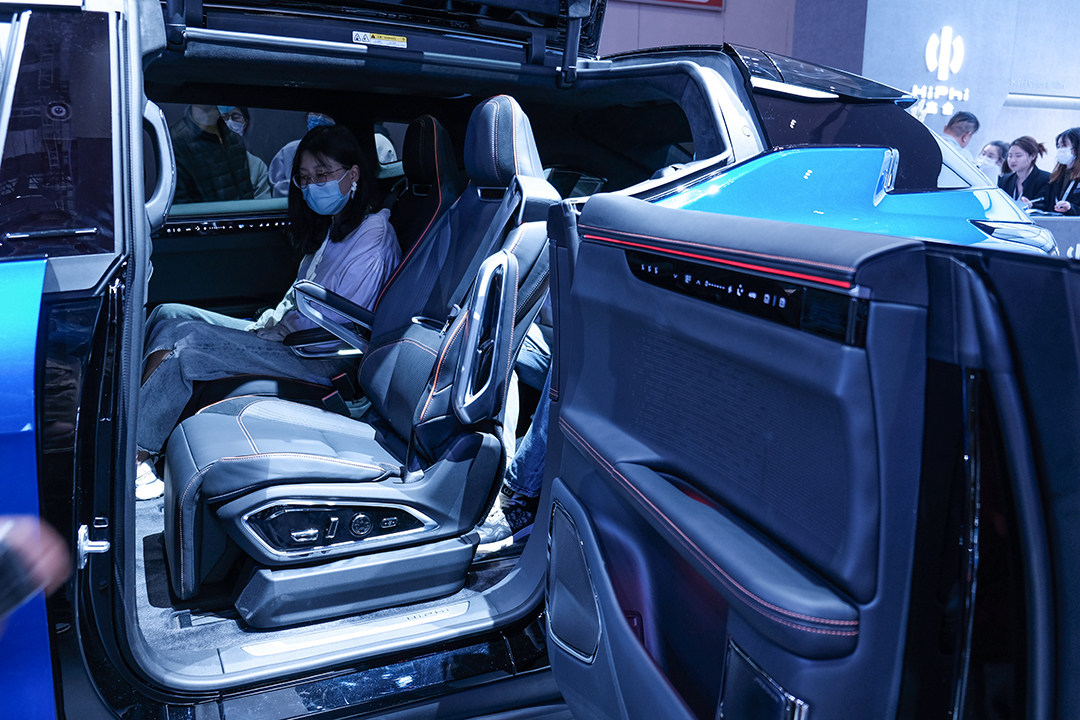 而除了三块大屏之外,高合 HiPhi X并没有在前排内饰的造型设计方面带来很大的亮点,可以说这三块包围着前排的屏幕就是这款车型中控的所有造型设计。而在后排,高合 Hiphi X首先通过独特的鸥翼门+对开式车门设计带来强烈的视觉冲击力,给人留下深刻的印象。座椅的设计比较优秀,支持多向电动调节,甚至连座椅的左右移动以及第三排方便进入模式都是通过电机来完成。