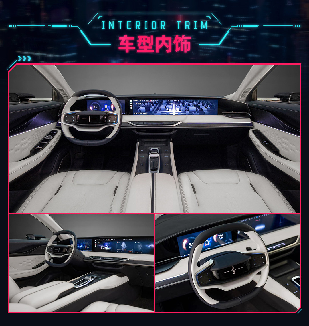 用料上该车并没有使用林肯惯用的棕色皮革,而是使用白色与黑色的搭配,相信是为了凸显车辆的前卫感和时尚感。座椅也使用上了白色皮革,这对于后期车主日常清洁提出更高的要求,相信未来林肯会推出一款全黑内饰或者同为棕色内饰可选。