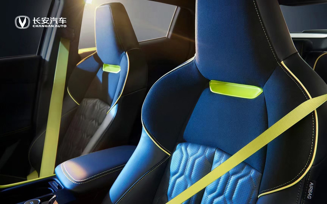 值得一提的是,UNI-T运动版还使用上了亮黄色的安全带,安全带是一项很好凸显个性的配置。座椅方面,与成员经常接触的部分使用了菱形花纹点缀,当然缝线依旧是使用亮黄色设计,与车辆内部形成统一风格。
