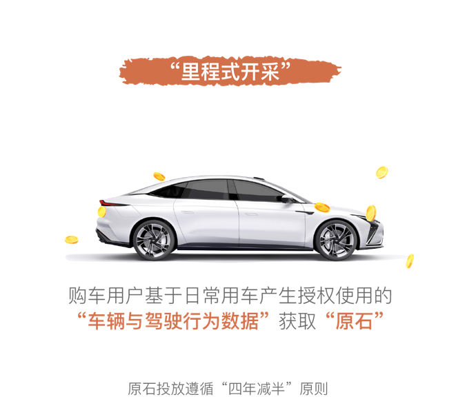 Ÿ 里程式开采:购车用户基于日常用车产生授权使用的“车辆与驾驶行为数据”获取“原石”。车主从开始驾驶车辆的那一刻起,就已开启了“里程式开采”模式。在车辆使用过程中,基于先进的智能合约技术,原石将以一个约定的速度随机掉落。该部分“原石”占总量70%,原石产出将遵循“四年减半”原则。