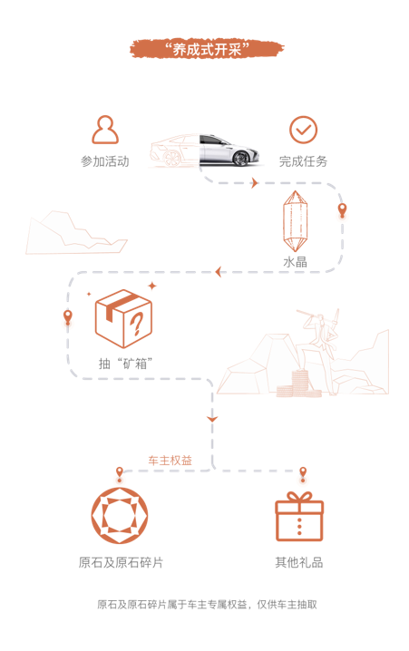 Ÿ 养成式开采:用户参与智己汽车官方组织的共创活动,或完成APP上的互动任务,赢得积分“水晶”,使用一定数量的“水晶”抽取“智己矿箱”,赢取各种礼品;购车用户有机会获得数据权益“原石”或“原石碎片”。该部分“原石”占总量30%。