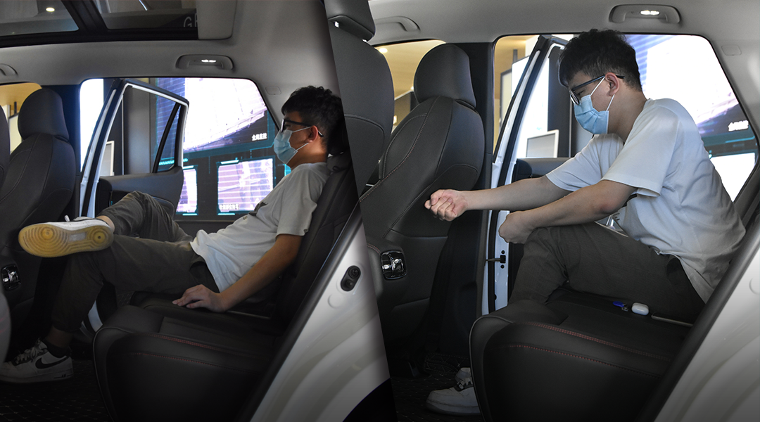 而买买君想要找的AION V在展厅的一侧,话不多说,咱们直接进车内感受,我们先坐进主副驾驶,把座椅调整到合适舒适的位置,然后再到后排体验。身高近180cm、体重75kg的买买君坐到后排时,腿部足足还有三四拳的空间、头部也有近两拳的空间,无论是跷二郎腿还是“葛优躺”,均无压力。
