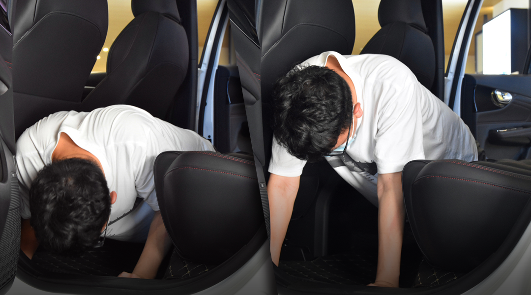 为了更加形象生动的描述后排空间的宽敞感,买买君在后排做起了运动,你们不要想歪,做的是正规运动,得益于全平的地台以及宽敞的退步空间,买买君可以轻松做起俯卧撑和平板支撑等运动。
