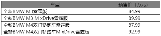 高性能车迷翘首以盼的全新BMW M3和全新BMW M4双门轿跑车在上海车展前夜震撼上市,厂商建议零售价为84.99万元-92.99万元。两款新车完美展现了高性能车市场标杆的领创形象,为客户带来了更加数字化、令人心潮澎湃的全新高性能驾驭体验。新车型搭载史上最强劲的M直列六缸双涡轮增压发动机,提供同级最佳的运动驾驶体验,雷霆版四驱车型百公里加速仅需3.5秒。迈入新时代的BMW M将进一步激发这些创新技术在高性能领域的潜能,引领高性能车细分市场未来技术发展风向,持续巩固M品牌的领创形象。