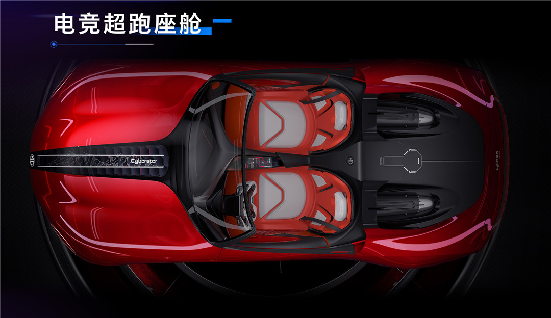 锐利的扁平宽大的前脸设计,呈现俯冲姿态,使得消费者第一眼望去能够感受到它的那份运动的气息,车盖部分由一条粗壮的黑色饰条进行分割,细节之处藏有两条可发光的灯带以及Cyberster字样的设计,与前车窗形成一个整体,使得整个车头的层次感更加的分明。
