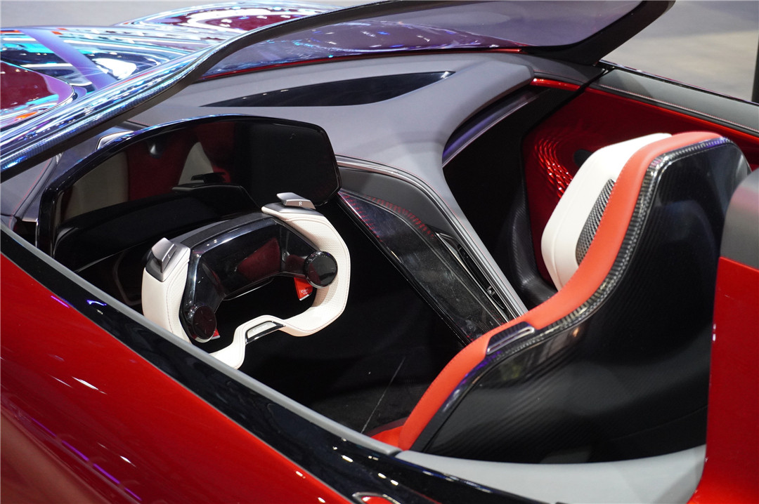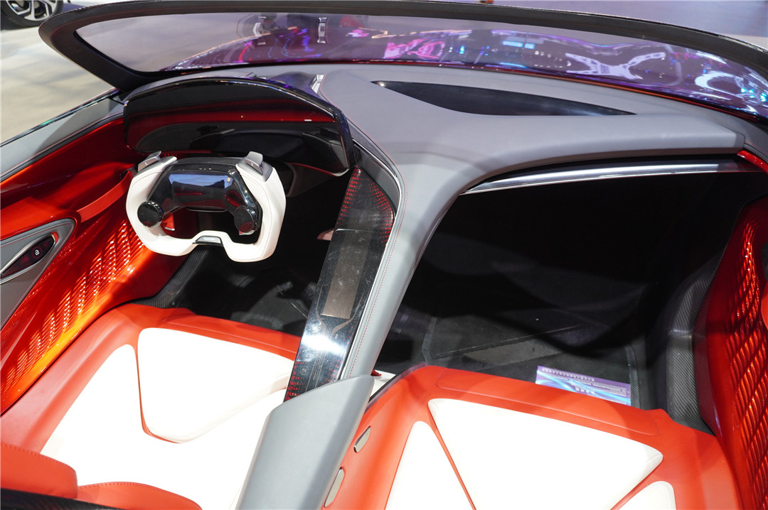 唯一能够明显可见的只有一块信息高度集成的曲面屏幕,设置在驾驶者视野最集中的地方,搭配上游戏手柄般的方向盘以及电竞座椅般的设计,使得驾驶者一次出行都能够体验到打游戏般的乐趣。