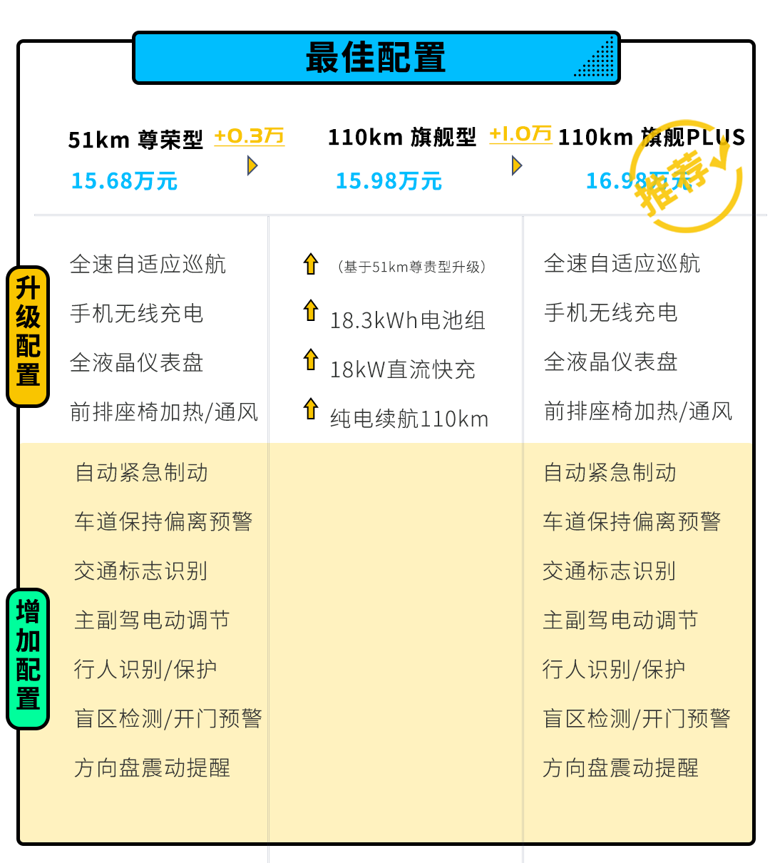 如果预算充足,充电条件也比较方便的话,直接一步到位上顶配110km旗舰PLUS版。低配110km旗舰版车型相较于51km尊贵型来说,它的升级仅有18.3kWh电池组、18kW直流快充转接头,以及PM2.5绿净系统。