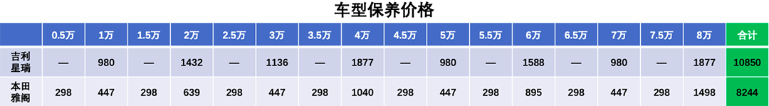 另外,在保养方面也存在一定的差距。根据车主保养手册查得,吉利星瑞的保养周期为1万公里一次保养,而本田雅阁的保养周期为5千公里。单从保养周期来看,应该是吉利星瑞的后期保养费用更为便宜。