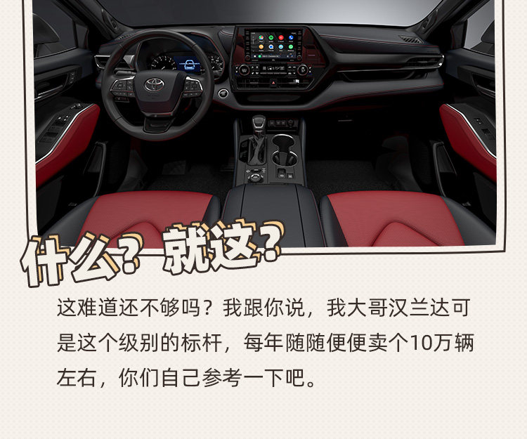 动力足、总体配置不低、也是七座后排可应急、虽然价格跟汉兰达起步齐平,保值率也没汉兰达高,但作为竞品确实是不错的选择,重点人家现在有1万+以上的优惠。