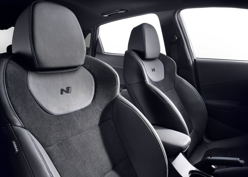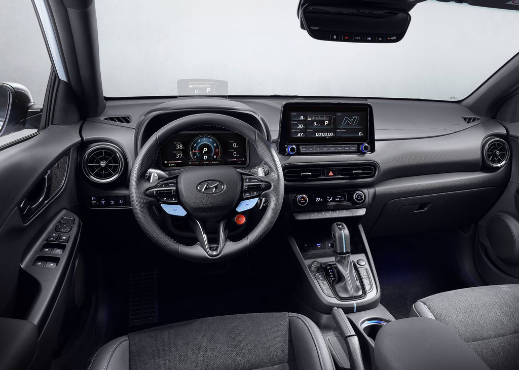 内饰方面,KONA N采用了N品牌独有的内饰设计,车内物理按键同时还能作为氛围灯使用,液晶仪表和中控显示屏均为10英寸,并且还支持显示定制化,驾驶员可以根据自己的喜好,通过多功能方向盘设定显示胎压、转向G值等数据,以及调整Eco、Normal和Sport三种驾驶模式,战队感十足。除此之外,内饰多处使用蓝色缝线作为细节点缀,营造出运动氛围。
