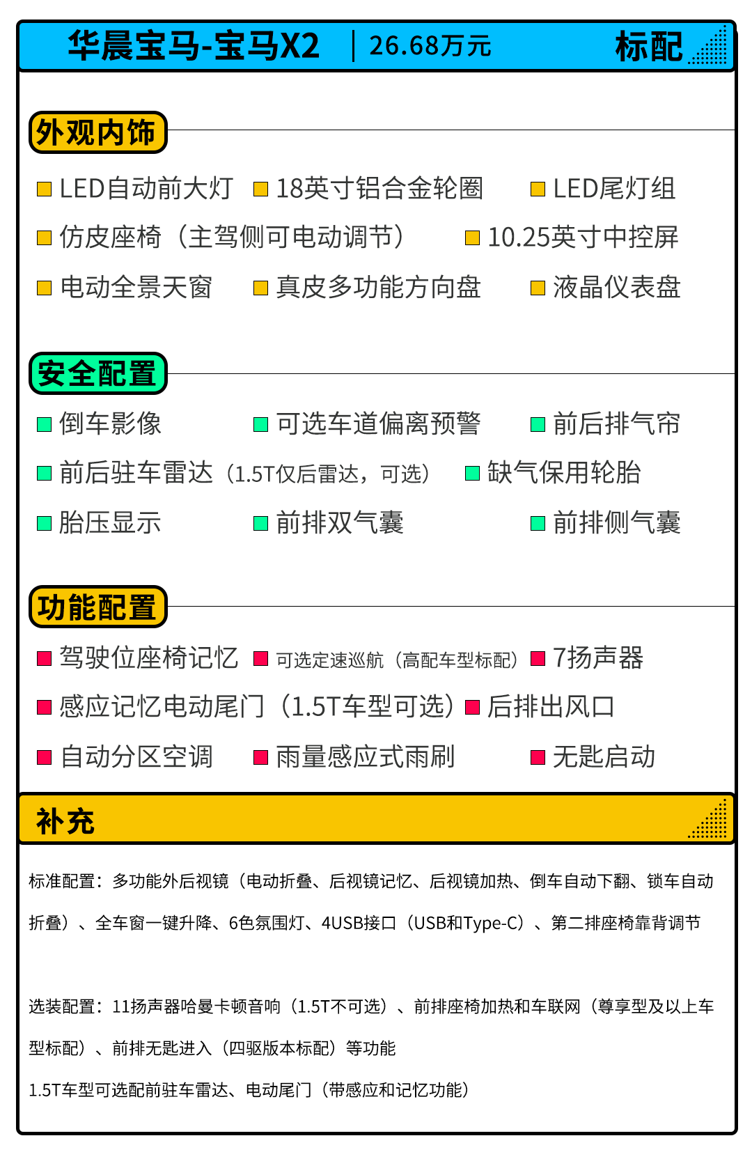配置方面,宝马X2的标配比较丰富,具体请看下表。
