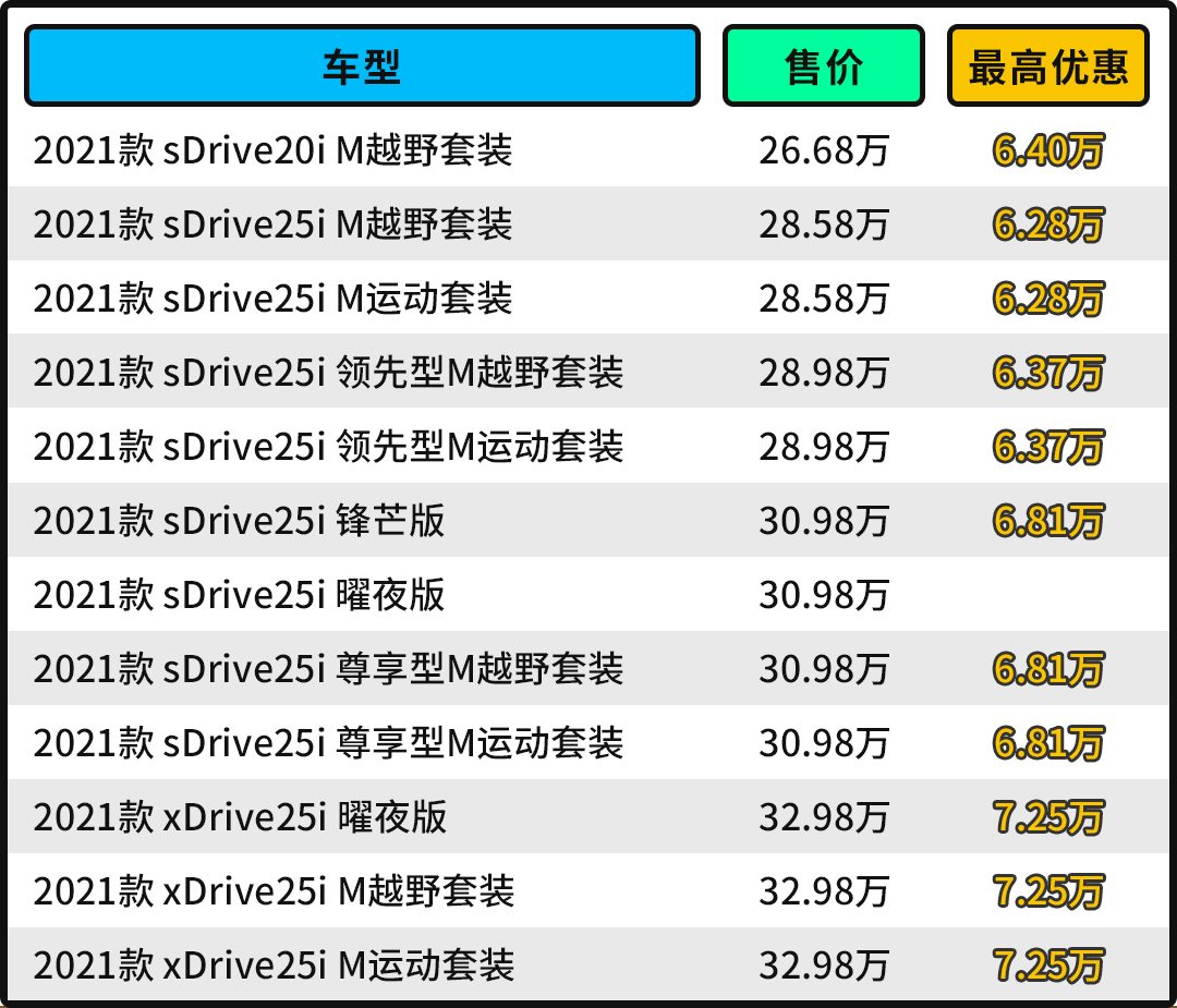 如果要买买君推荐的化,我会推荐sDrive25i 领先型M运动套装,因为运动版的外观相较于运动版会更适合城市用途,并且配置丰富,再结合6.37万元的最大优惠,整体性价比会显得比较高。