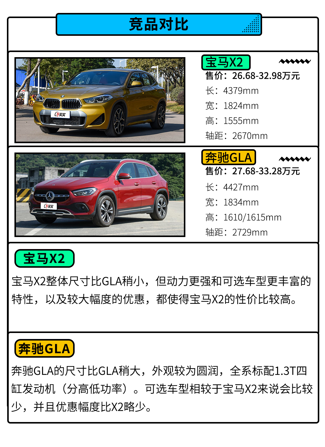 另外来说,X2的竞争对手正是奔驰GLA,它们的定位和售价都非常相似,具体的对比请看下表。