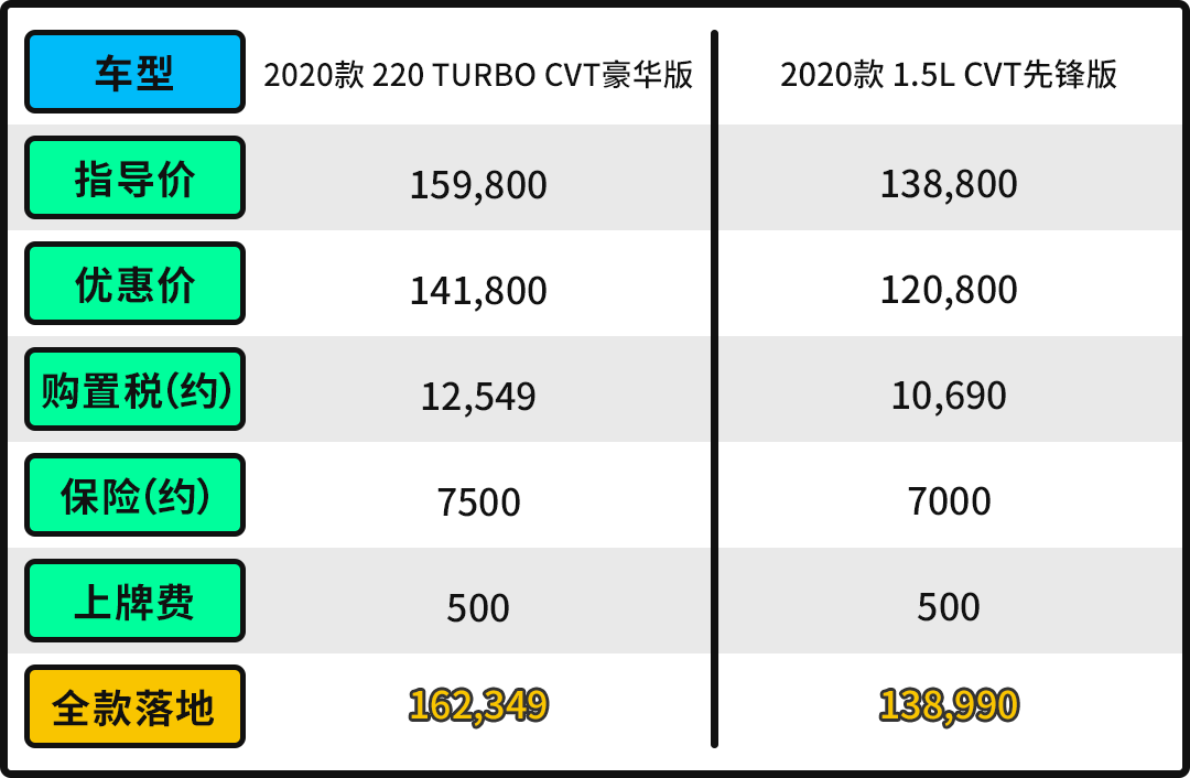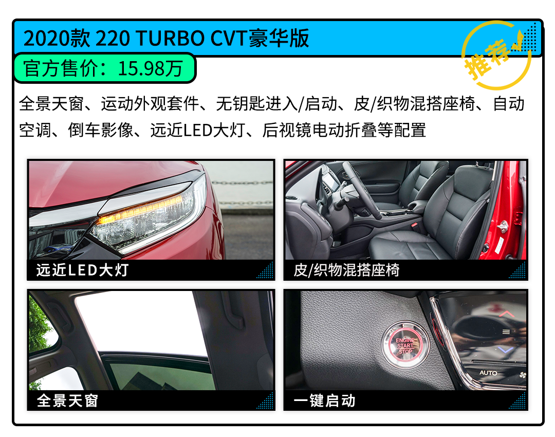 对于现款车型配置的选择,买买君更青睐1.5T车型,毕竟动力确实强一点,驾驶体验会更好,优先推荐2020款 220 TURBO CVT豪华版,虽然比精英版车型贵了1.4万,但多了全景天窗、运动外观套件、无钥匙进入/启动、皮/织物混搭座椅、远近LED大灯、后视镜电动折叠等配置,性价比还行。当然具体怎么选择,还根据自己的预算来,对于动力没追求,或者配置没有很高要求的,其实考虑2020款 1.5L CVT先锋版也行,也能够满足日常所需。