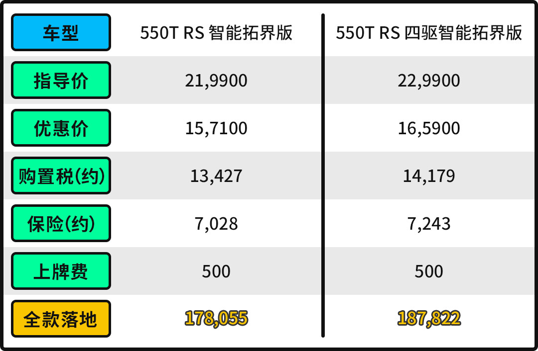雪佛兰探界者在中期改款之后,由此前的8款配置缩减为6款配置,一定程度上减少了消费者对于配置的可选性。而在这6款配置之中,买买君较为推荐选择2.0T入门版车型(即550T RS 智能拓界版)。而选择该版本车型的合计落地费用约为178,055元。