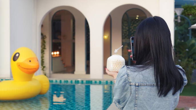 一楼是户外公共区域,设有一个超大的游泳池,小黄鸭应该也是公共玩具,但它的表情看起来很惊悚,莫名有一种美剧的感觉。