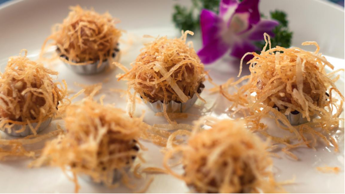 其它几道菜也逐一端来了,这道叫“金丝墨鱼丸”,摆盘很精致,而吃起来更是有惊喜,里面除了墨鱼丸味道,还加了一点芥末,够刺激~