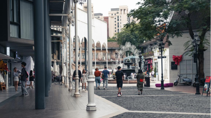 将住宿落实以后,她说今天有点累了,晚上想找个能饭后散心的地方,于是在她的推荐下,佛山岭南新天地是我们今晚的目的地。