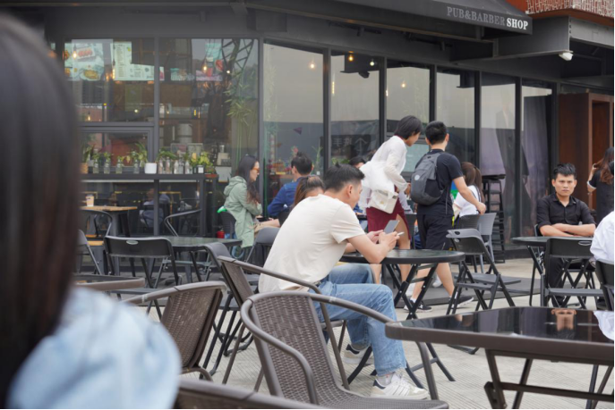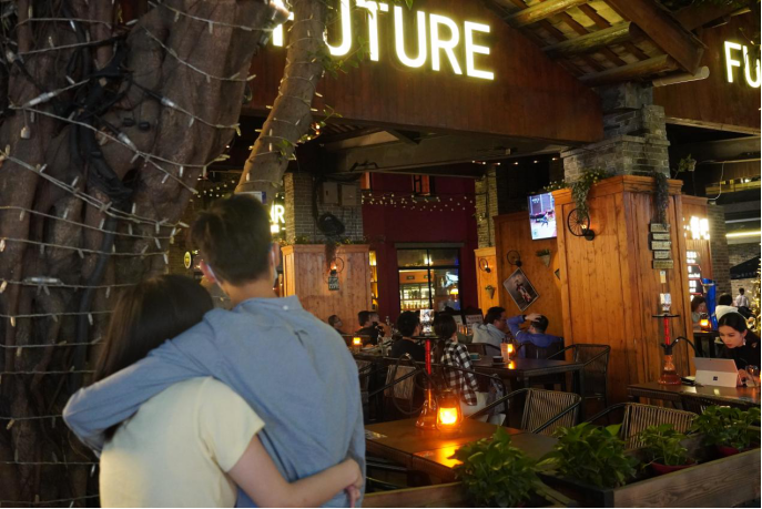 而岭南新天地另一主打就是休闲酒吧,每逢篮球、足球赛,都会聚集大量球迷在此,你看,情侣们看得津津入味。