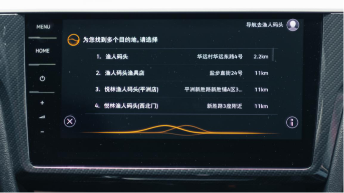 “导航去渔人码头”,车机系统就能精准识别并且推送定位,我们要去的就是第一个,看着路程不远应该就在附近。