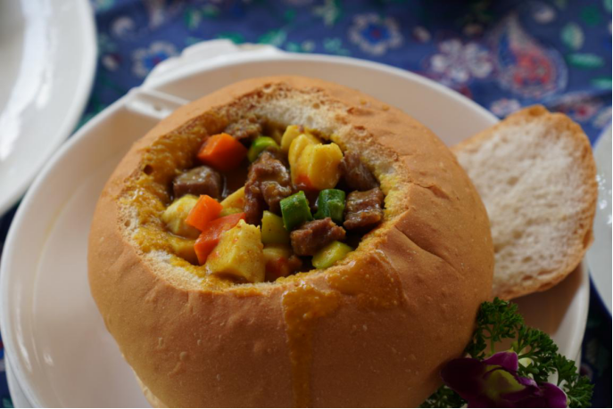 这款“咖喱面包”是女朋友点的,端上来我还以为是个南瓜...里面的料非常足,虽然咖喱牛肉的味道很不错,但我还是更想尝尝咖喱味的面包...