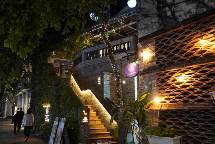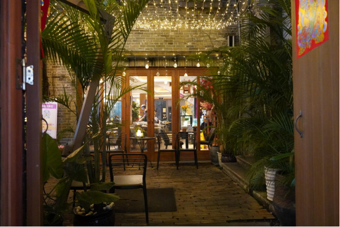 这家店外立面是大量古老的青砖,附上一些绿植和灯带点缀,浪漫氛围一下子就来了。