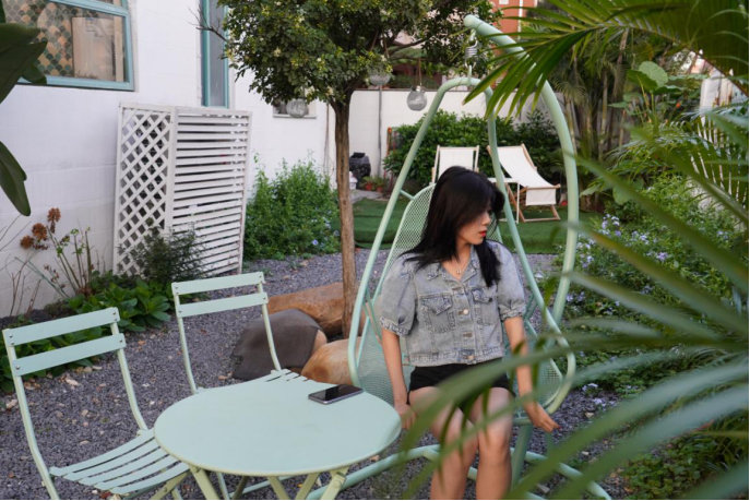 侧面还有可休息的小花园,桌子椅子的配色都是薄荷绿,很搭配,这样的生活太惬意了!