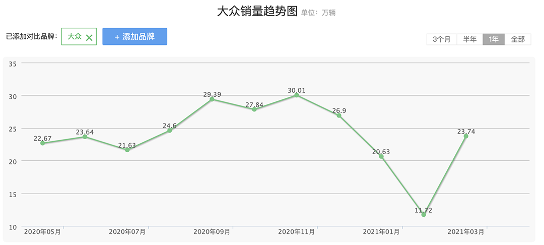 2020年大众品牌在中国市场累计销量为285.11万辆,同比下滑9.9%,降幅高于乘用车市场整体;但在大众售出21.2万辆新能源车型,其中纯电动车型增量明显。这种衰落可以说是电动化转型之后的空窗期,并非实力的下降。