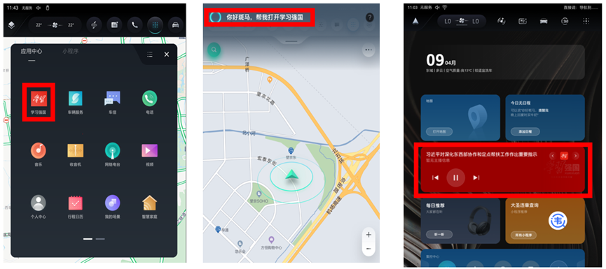 “学习强国”车载版在设计之初就深度融合出行场景,以多样化的学习形式确保行车安全。在汽车行驶途中,音频内容将被突出,核心重点内容可一键快速播放,文章阅读则强化口播,视频内容会将画面进行安全遮挡,结合AI智能语音交互,保证专注行车,安全学习;在驻车时,用户可以观看视频学习。值得一提的是,“学习强国”车载版还能与PC端、APP端和TV端进行账号同步,用户只需在首次打开时用“学习强国”手机APP扫描二维码绑定车载版,就能实现学习积分同步。