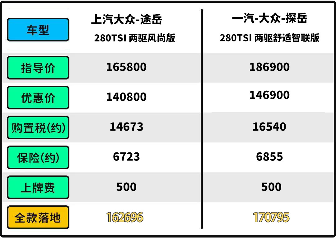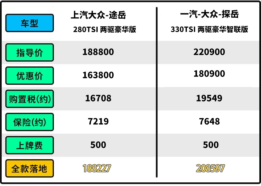 那么途岳和探岳在市场上主销的版本之间的售价差距又有多大呢?根据两边销售给到的答复,途岳的280TSI 两驱豪华版(指导价18.88万)和探岳的330TSI 两驱豪华智联版(指导价22.09万)是两款车型主销的版本。综合优惠以及保险和税费等综合计算,途岳最终的落地价为18.82万,探岳最终落地价为20.86万。