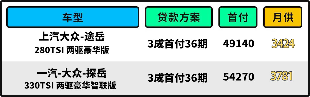 而以贷款的方式购车的话,两车均以3成首付36期计算,途岳首付金额为49140元,每月月供3424元;探岳首付金额为54270元,每月月供为3781元。但考虑到探岳为2.0T动力,在变速箱的稳定方面也要优于途岳,因此即便最终探岳的价格更高,该车也依旧值得优先考虑。
