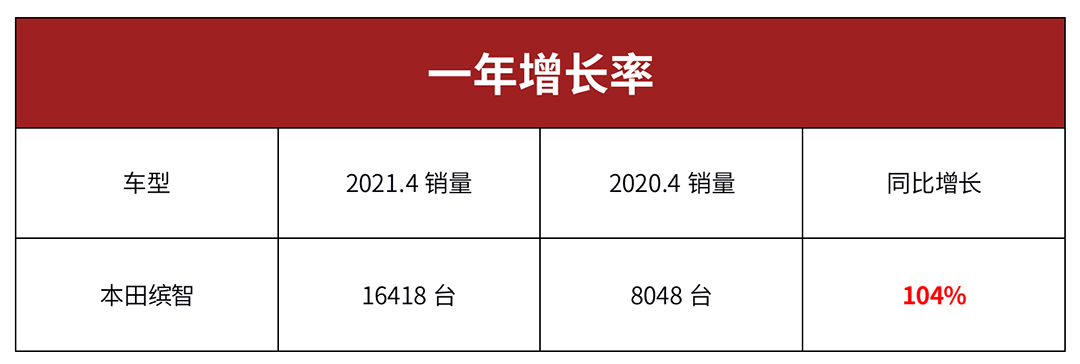 但你们以为CR-V火力最猛的话可能就想错了,因为4月同比去年,CR-V只增长了77.9%,但是缤智呢?厉害了,增长104%,从8048台直接翻了一倍来到16418台。