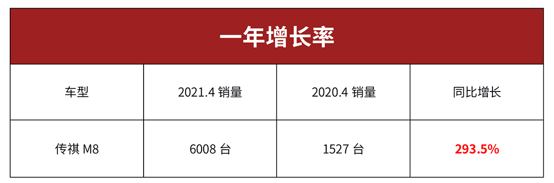 当然,295.3%的数据看似很美丽,但实际也只是销售了6008台而已,因为去年4月份传祺M8还叫GM8的时候只卖了1527台。
