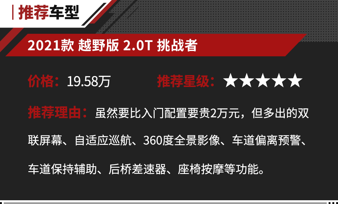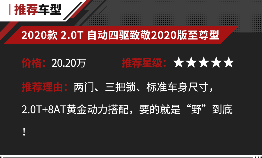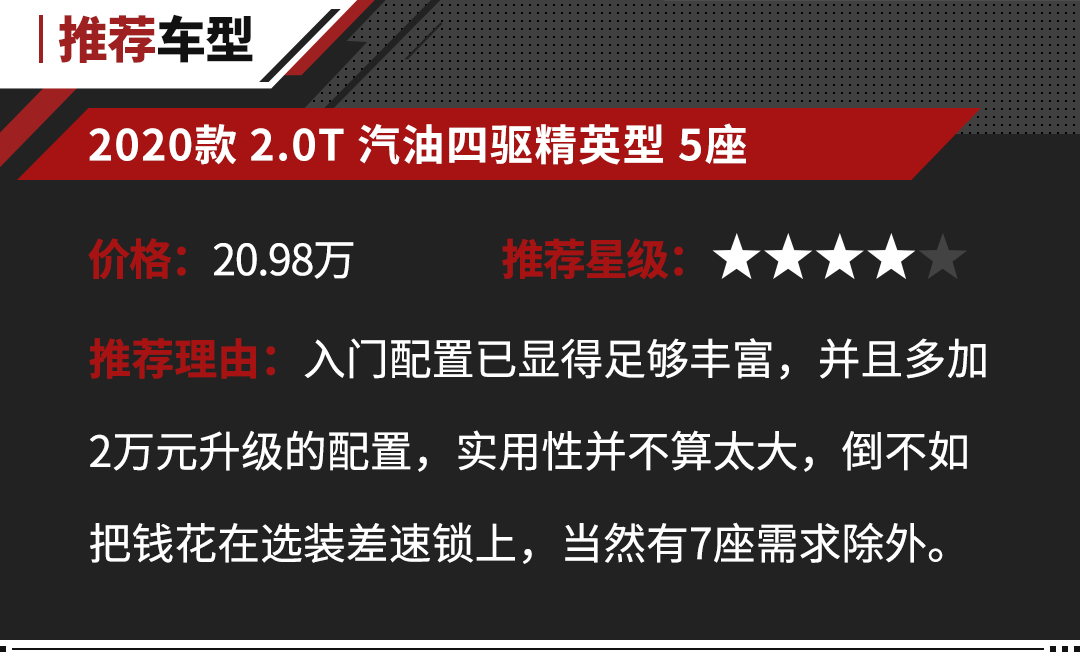 更重要的是,在入门配置消费者就能够根据个人需求,进行前后桥差速锁的选装,这一点是比较人性化的,毕竟不是每个人都会经常去一些较为“野”的地方,考虑到轻度户外爱好者的需求。