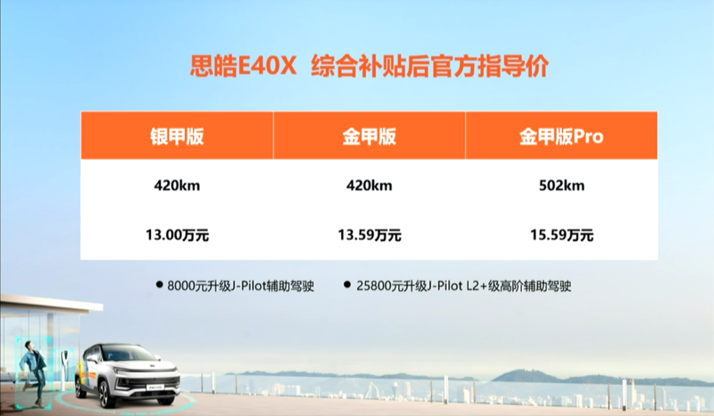 5月16日,新一代智能纯电SUV思皓E40X正式上市,补贴后的官方指导价为13万-15.59万元。即刻起前往官方线上订车可享价值3万元的购新礼包:首任非营运用户可享受三电终身质保、终身免费车联网基础流量以及免费充电桩安装权益,另外还赠送10000元DIY炫改抵用券、4000元原厂精品、2000元智能车载电站、3000元智能充电桩以及至高9000元金融贴息。