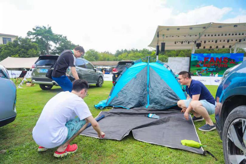 露营区则是一派热闹景象,初次相识的体验者们密切合作,搭帐篷、打地钉、防潮垫充气,很快便建造起一片生活区域。场地中间,孩子们玩耍打闹,妈妈们有的展示着自己提前备好的食品,有的架起了烤炉,满怀期待地聊着爸爸们能否带着钓上的鱼归来。她们因为斯巴鲁相识,恍惚间也将这里当成了她们共同的家。