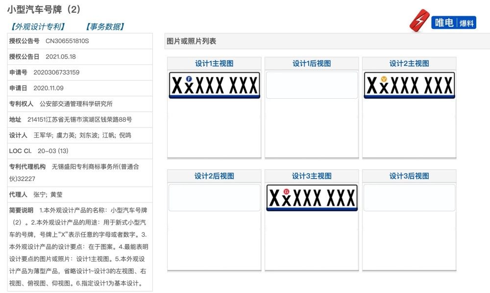 近日,教授从相关渠道获取了来自公安部交通管理科学研究所申报的全新车牌样式外观专利图,此次全新车牌包括了“小型汽车号牌”与“临时行驶车号牌”两种。从该专利图来看,全新车牌与现款车牌在设计样式上、字数等有很大的不同。