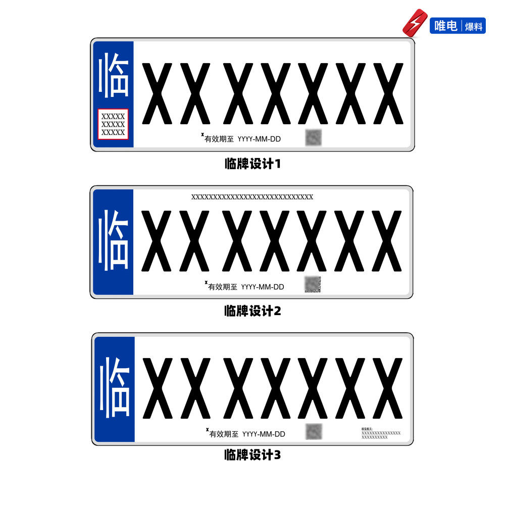 除此之外,临时牌也发生了更多的变化。与现在车牌后面一样拥有5位数,但提供了3款不同样式,均配有二维码区域,不过与现有的行政区域内、跨行政辖区以及临牌的尺寸有很大的不同。