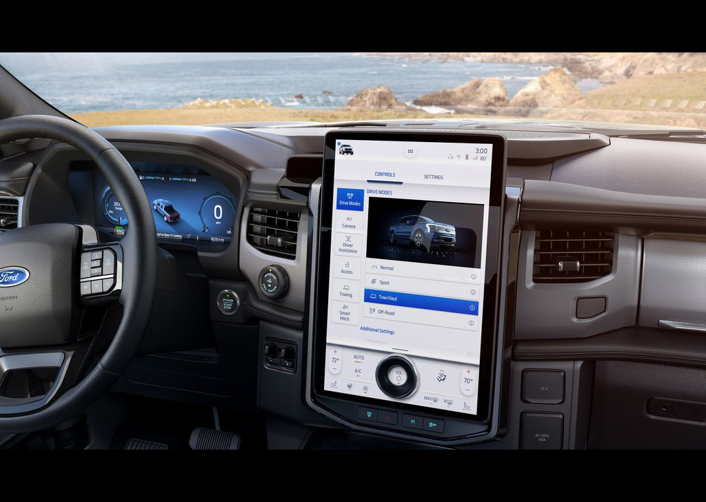 F-150 Lightning的搭载了更多的科技配置,为驾驶者提供更为先进的智能体验。中控配有15.5英寸触摸屏,首次搭载了SYNC4系统,能够自适应驾驶者的操作习惯。12英寸仪表盘进一步提升了数字体验,它具有可自定义的界面,显示的信息可清晰地传递车辆在高速公路辅助驾驶模式下的运行情况。