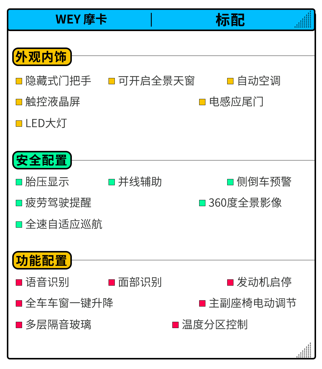 现如今随着智能化时代的到来,WEY品牌也开始了自身产品智能化的趋势转变。而即将上新的玛奇朵、咖啡、摩卡这几款新车就是WEY应对未来SUV智能化所给出的答案。在这产品战略布局当中摩卡率先上市。